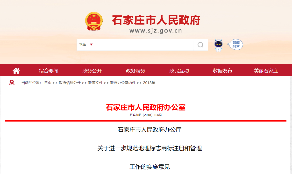 2024-09-09 10:53:29石家庄市人民政府办公厅关于进一步规范地理标志商标注册和管理工作的实施意见各县(市、区)人民政府,高新区、循环化工园区和综合保税区管委会,市政府有关部门:为认真贯彻落实2018年中央一号文件《关于实施乡...